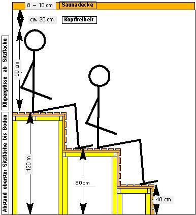Viele möchten ihre Sauna in den Keller einbauen. Das macht natürlich Sinn! Aber oft ist gerade der Keller ein Bereich mit einer Deckenhöhe unter den üblichen 240 cm. Was ist denn die Mindesthöhe? Ich denke die Raumhöhe von 200cm sollte die Grenze sein. Kleinere Menschen aber brauchen weniger Sitzhöhe. Mit weniger Kopffreiheit und etwas tieferer oberster Sitzfläche könnte man sich auf 180 cm "runtermogeln". Aber ohne Gewähr!