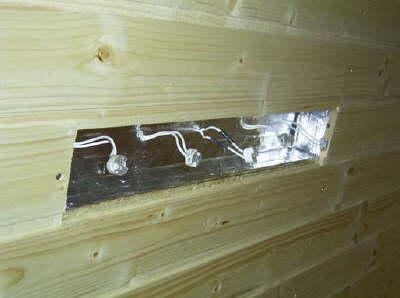 Der Bauraum ist (wie das komplette Deckenelement) mit Alufolie / Aluklebeband ausgekleidet. Über 5 Bohrungen wird das Silikonkabel nach oben / aussen geleitet. Die Bohrungen sollten nur so groß sein, dass das Kabel gerade so durch passt bzw. leicht klemmt. Auf der „kalten“ Deckenaussenseite wird das Silikonkabel nach einigen Zentimetern an ein normales Kabel gelötet (ab da sind keine wärmebeständigen Kabel mehr nötig).