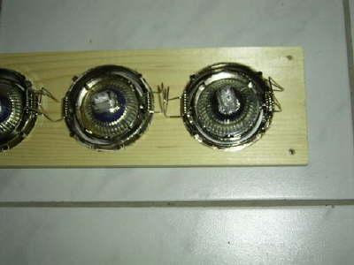 Ich habe 2 Pakete mit je 5 schwenkbaren Strahlern bei Hornbach gekauft und auf 2 Holzgrundplatten vormontiert. Dabei müssen die beiden Spannbügel pro Fassung aus Platzgründen – nach ca. 1-2 cm Überstand übers Montageloch - nach oben gebogen werden. Die 5 Kreisbohrungen sollten so knapp wie mögl. ausgeführt werden, da man ja von hinten an die Lampen drankommt habe ich die Bügel erst nach dem Durchstecken der Fassungen eingeklemmt.
