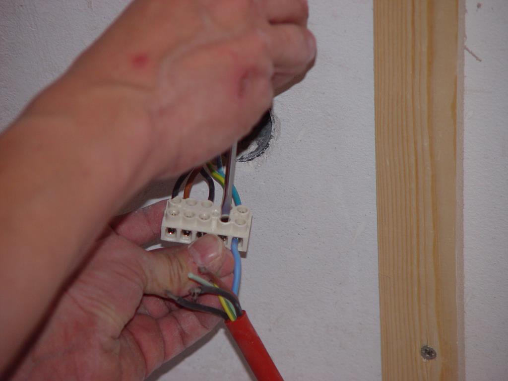 Das Verlegen der Spanplatten verdeckt den Stromanschluss. Also muss das Silikon Elektrokabel jetzt angeschlossen werden (Der Starkstrom ist mit 3 Sicherungen gesondert gesichert. Diese sind während der ganzen Zeit AUS!)