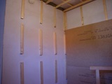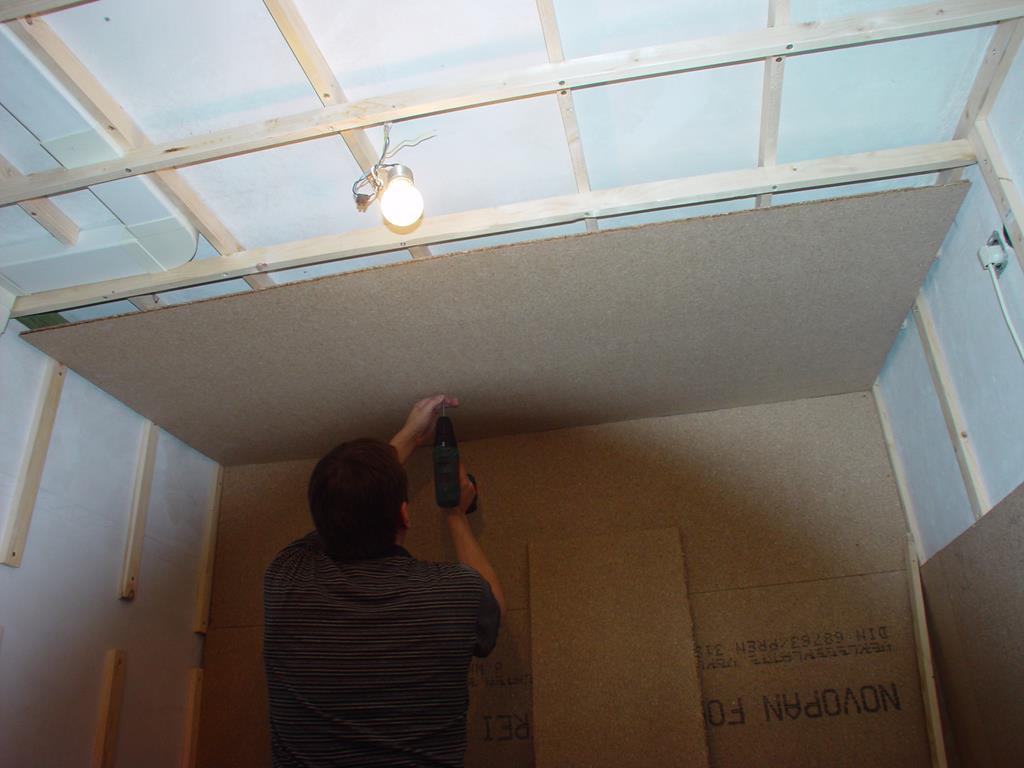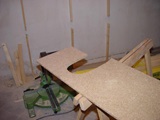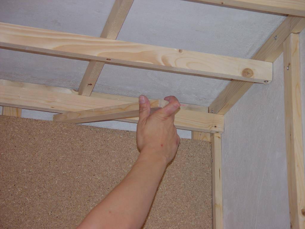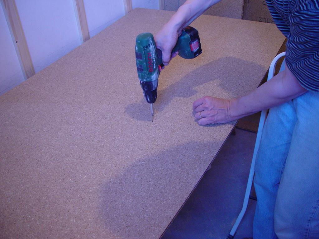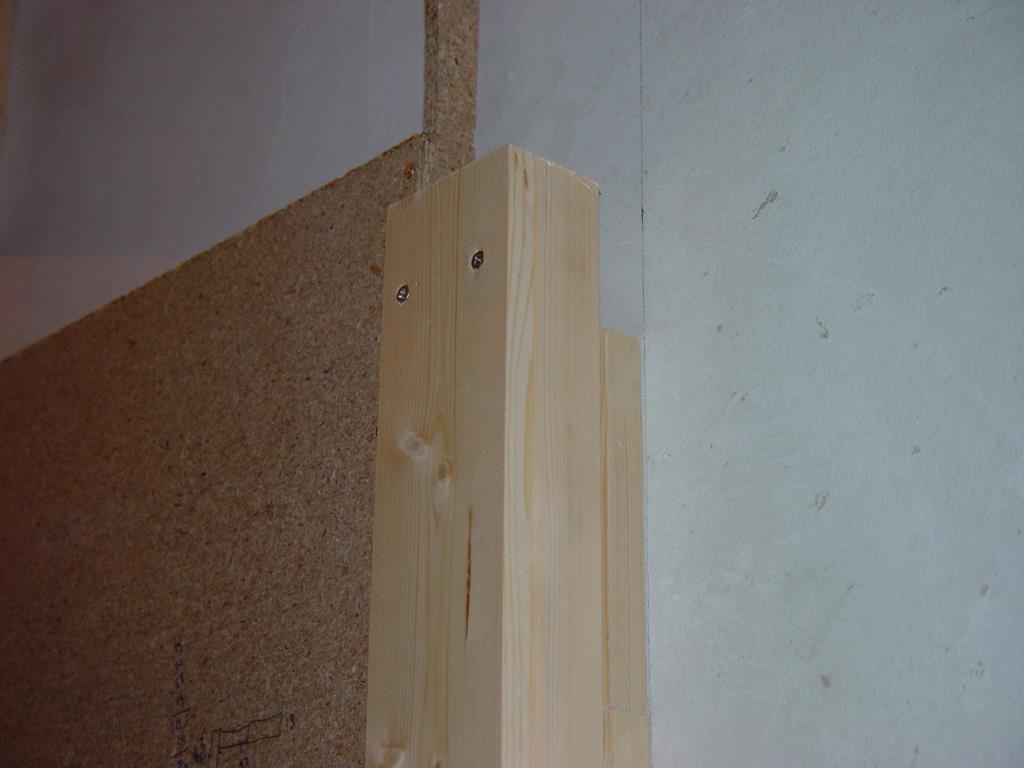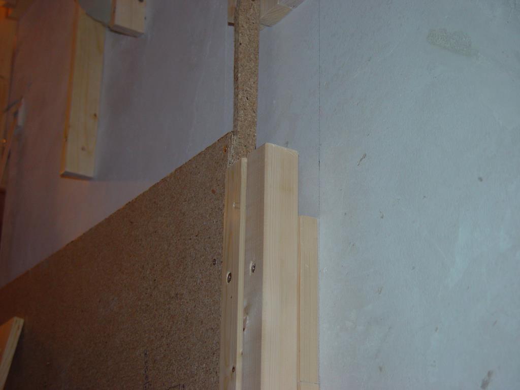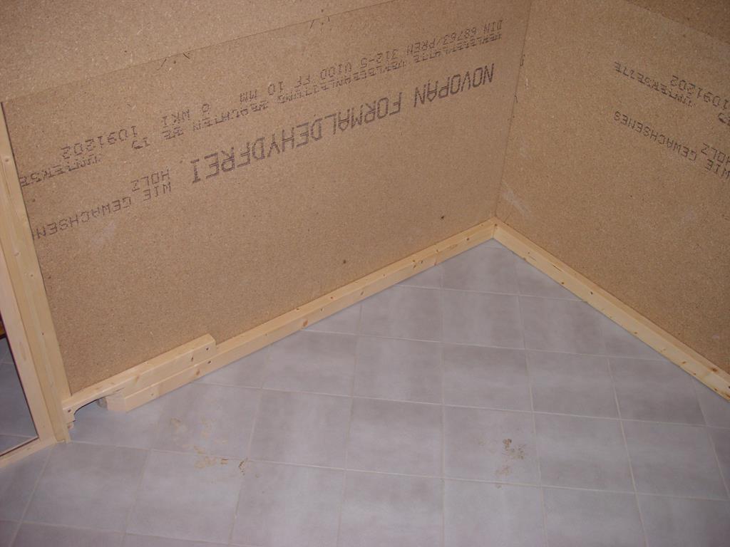 Auf die Dachlatten konstruktion werden nun die Spahnplatten geschraubt. Auf den Fotos nicht zu sehen: die Platten liegen nicht auf dem Boden auf, sondern es gibt einen dachlattestarker Freiraum.